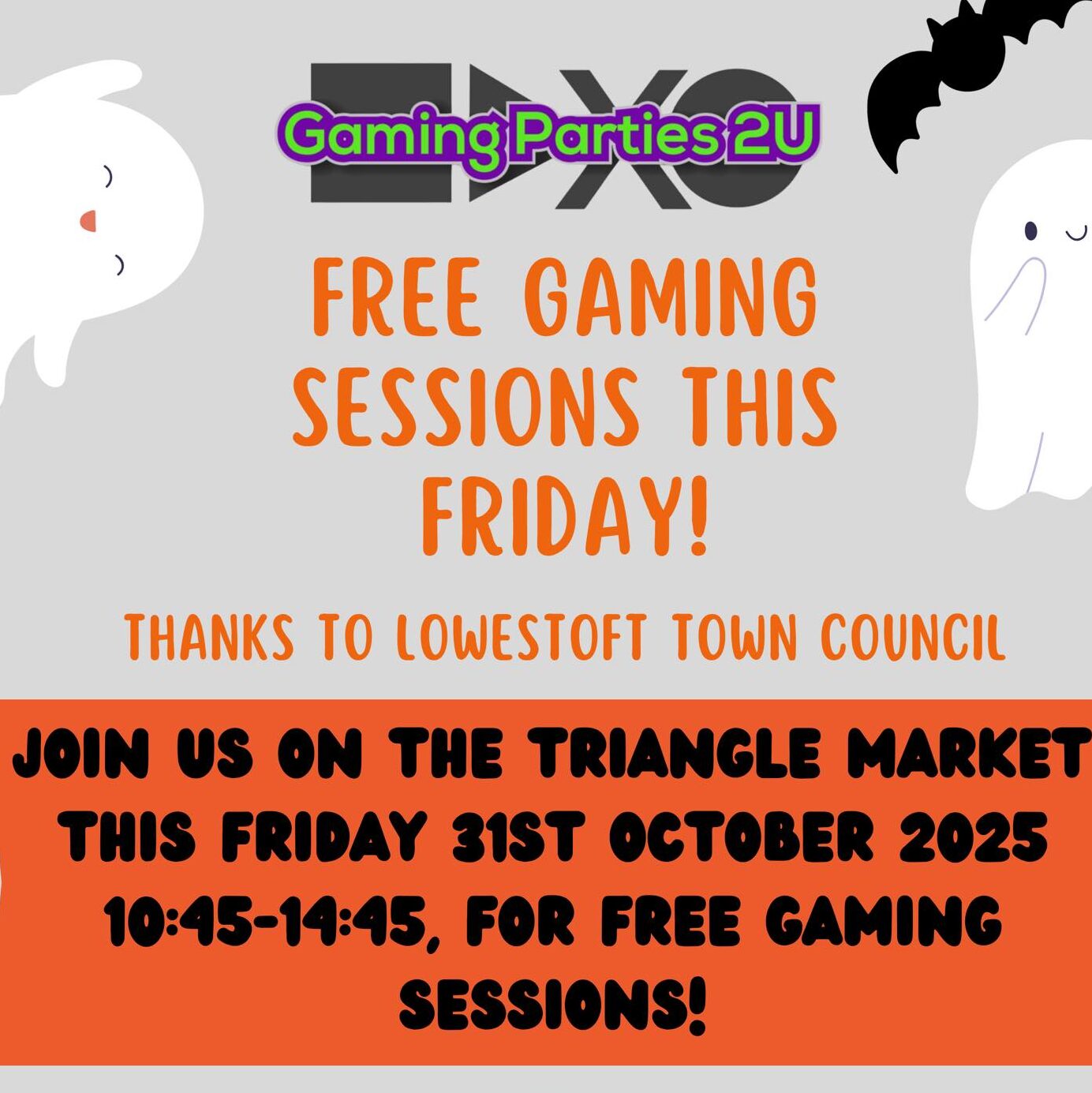 We’ll be on the Lowestoft Triangle Market this Friday offering free gaming sessions, thanks to Lowestoft Town Council. The gaming van will be decked out with spooky decorations, and we’ll have plenty of free sweets to give away! 🍬