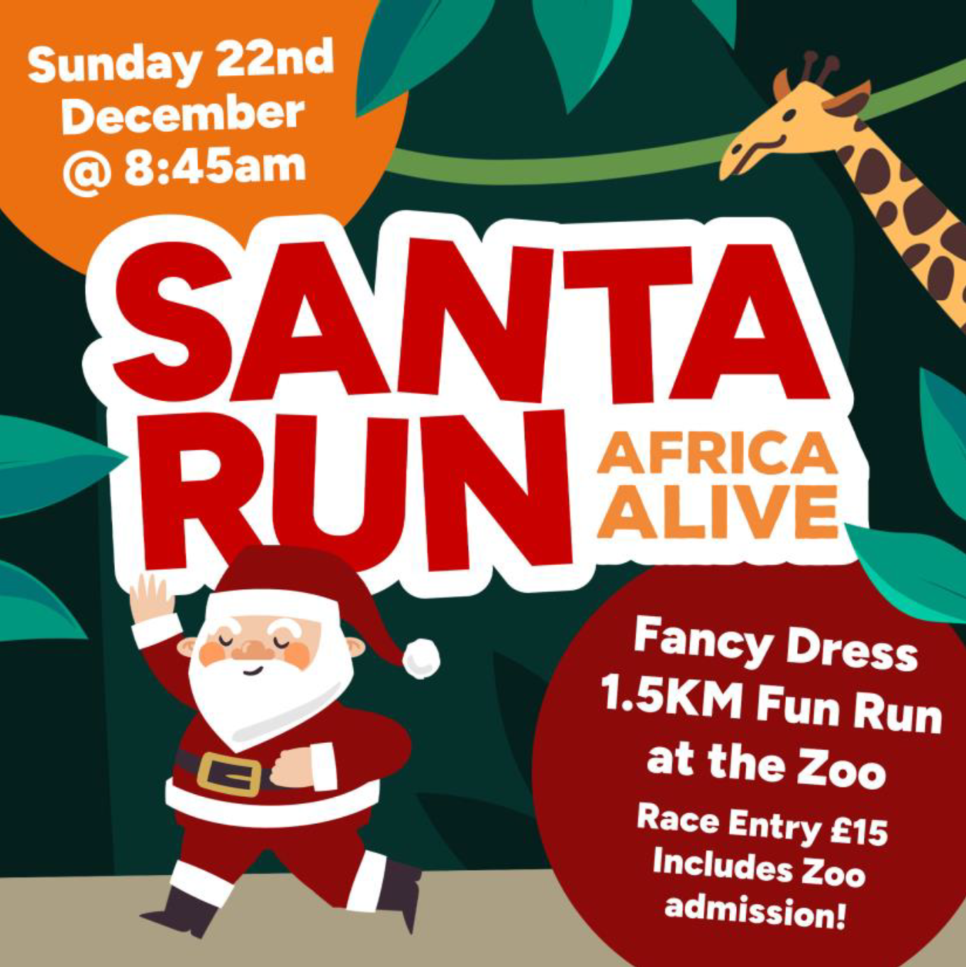 We are looking forward to seeing all the amazing Christmas costumes and welcome everyone to join us for the Santa Run 2024.’ Tom Craig-Moonie, Head of Operations at ZSEA. Tickets are £15 per person 3+ including spectators and £10 for 2’s and under. Tickets must be purchased online and shown at the gate for entry on the day. Book tickets now to take part in this festive fun Santa run and help us save animals! Find out more information and to join in the fun – https://www.zsea.org/reserve/santa-run-africa-alive