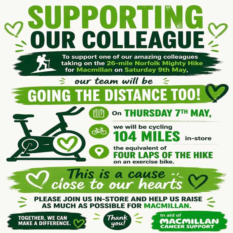 We’re going the distance for a great cause. Join us instore on Thursday 7th May as we cycle 104 miles in support of MacMillan cancer support.