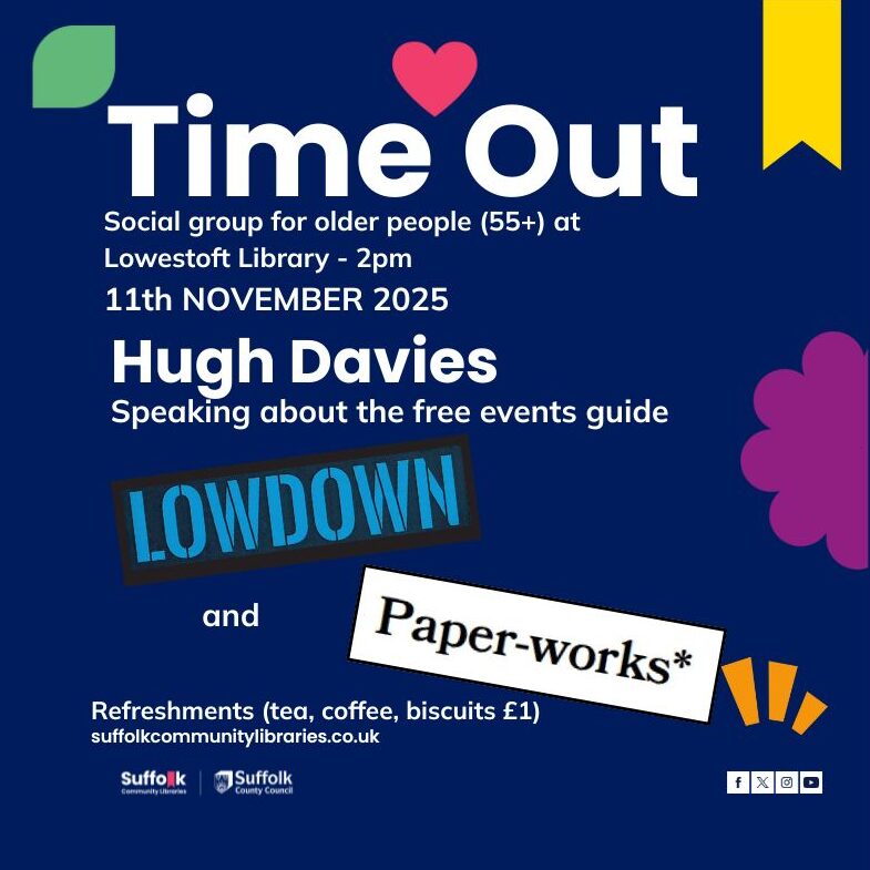Time Out at Lowestoft Library 2pm 11th November. Teas, coffees & biscuits £1 donation. If you’re 55+ and you’d like to meet new people, have a cuppa and chat, we have a variety of activities and speakers. This week we have Hugh Davies talking about Paper-works* Printing and Lowdown, Lowestoft’s free guide to “creative stuff”.